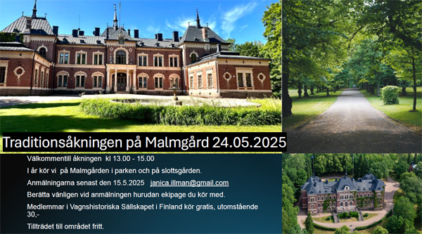 Medlemmarna i Vagnshistoriska sällskapet i Finland kallas till stadgeenligt årsmöte och till musébesök den 15 april 2018 till Kimito och Söderlångvik Gård www.soderlangvik.fi. Söderlångvik Gård är en uppseendeväckande kulturhistorisk sevärdhet. Gårdens gamla åkdon utgör ett separat muséum. Medlemmarna kan delta avec. Adressen är Amos Andersonvägen 2, 25870 Dragsfjärd.